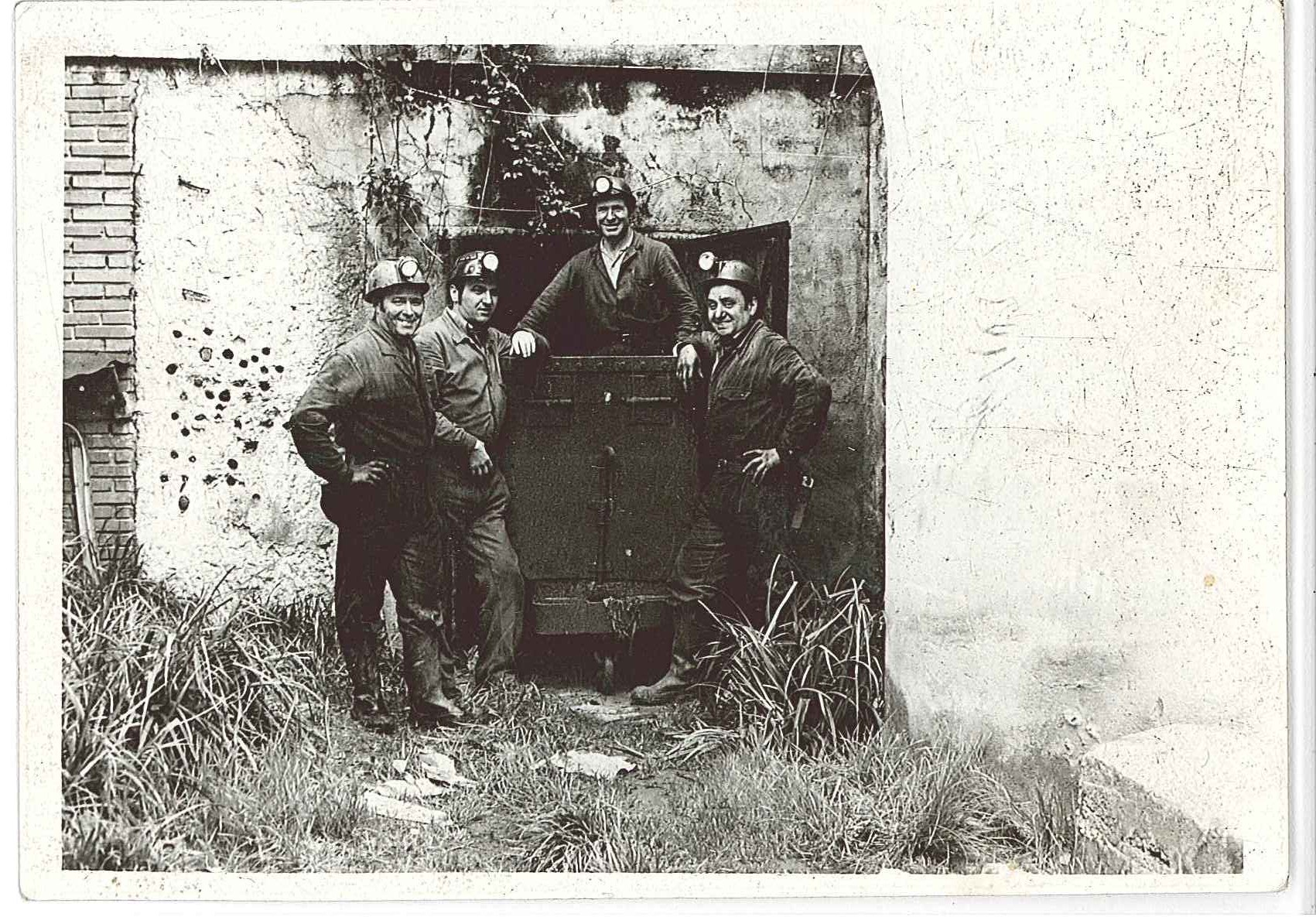 Fotografía de grupo delante de una bocamina situada en Blimea. De izquierda a derecha: José Vicente Rodríguez Iglesias "Facuriella", Juan Calviño, Sidonio y Manuel Díaz Miera.