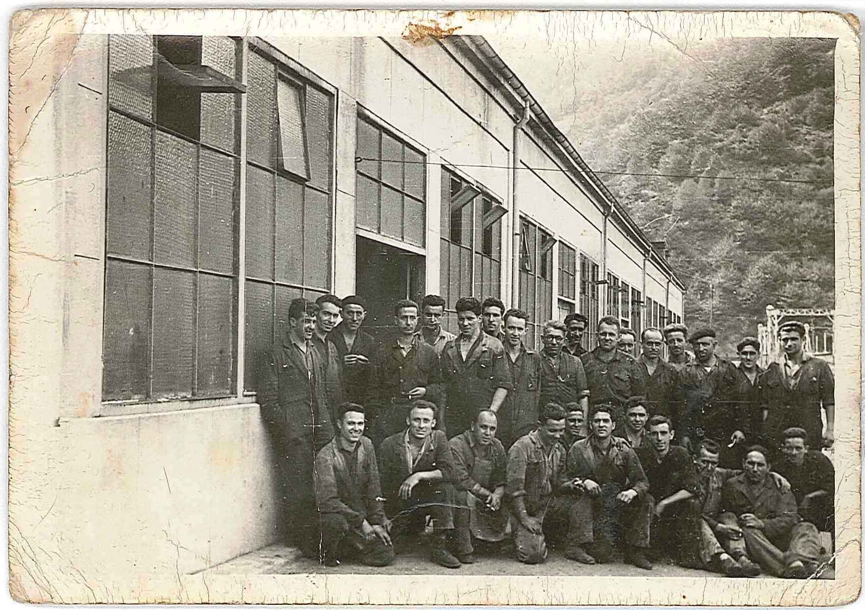 Foto de grupo en el exterior del taller de Duro Felguera en Barredos, en 1965.