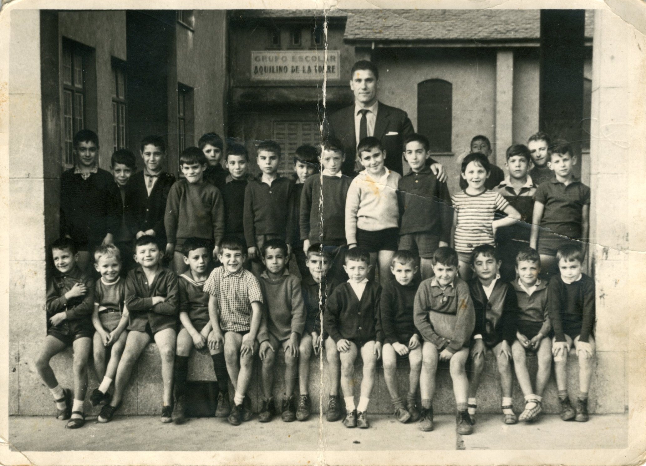 Retrato colectivo de un grupo de estudiantes ante las escuelas "Aquilino la torre" en Blimea.
