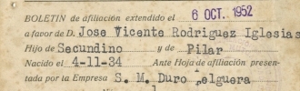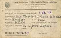 Boletín de afiliación a Duro Felguera, 1952.