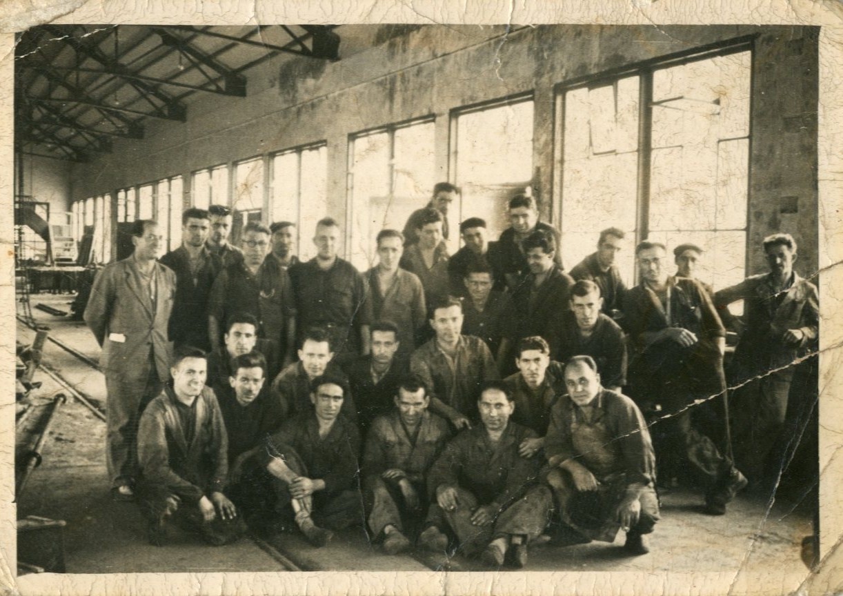 Fotografía de grupo en el interior del taller de Duro Felguera (Barredos) en 1965.
