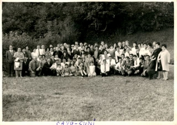 Fotografía de los invitados al enlace de Cayo y Suni, celebrado en Cerelluelo (Pola de Laviana) en 1968.