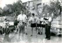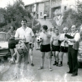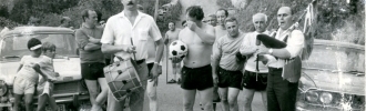 Los equipos de fútbol de las viejas glorias de L´Edrau y La Güeria de Carrocera se preparan para desfilar hasta el Prau de la fiesta con el fin de jugar un partido, en el año 1971.En la fotografía una pareja de gaiteros acompaña a los futbolistas hasta el Prau.