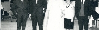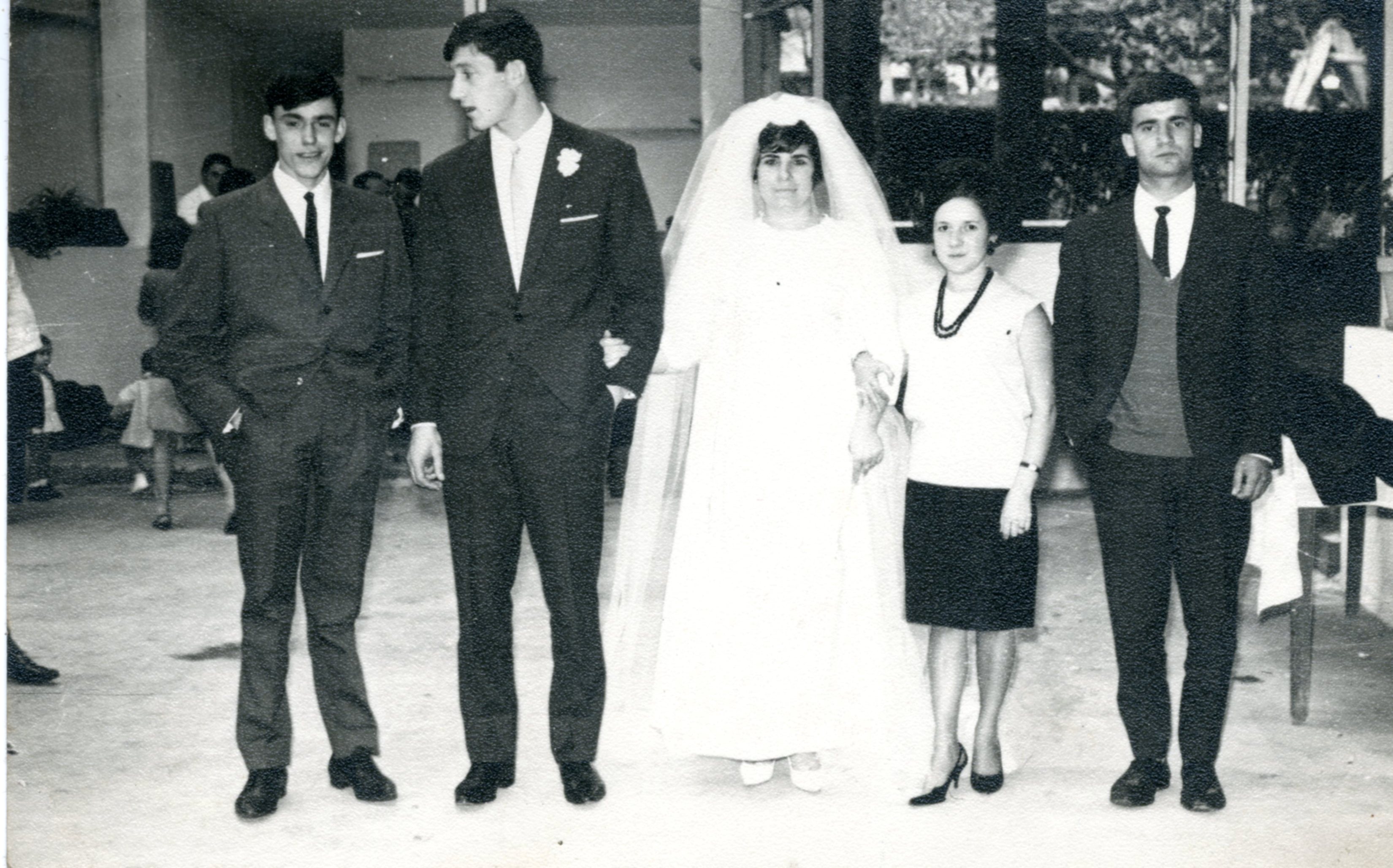 Retrato grupal con motivo de la boda que tuvo lugar en la década de los sesenta en Gijón para unir en matrimonia a José Manuel Llaneza y Sonia, vecinos del concejo de San Martín.