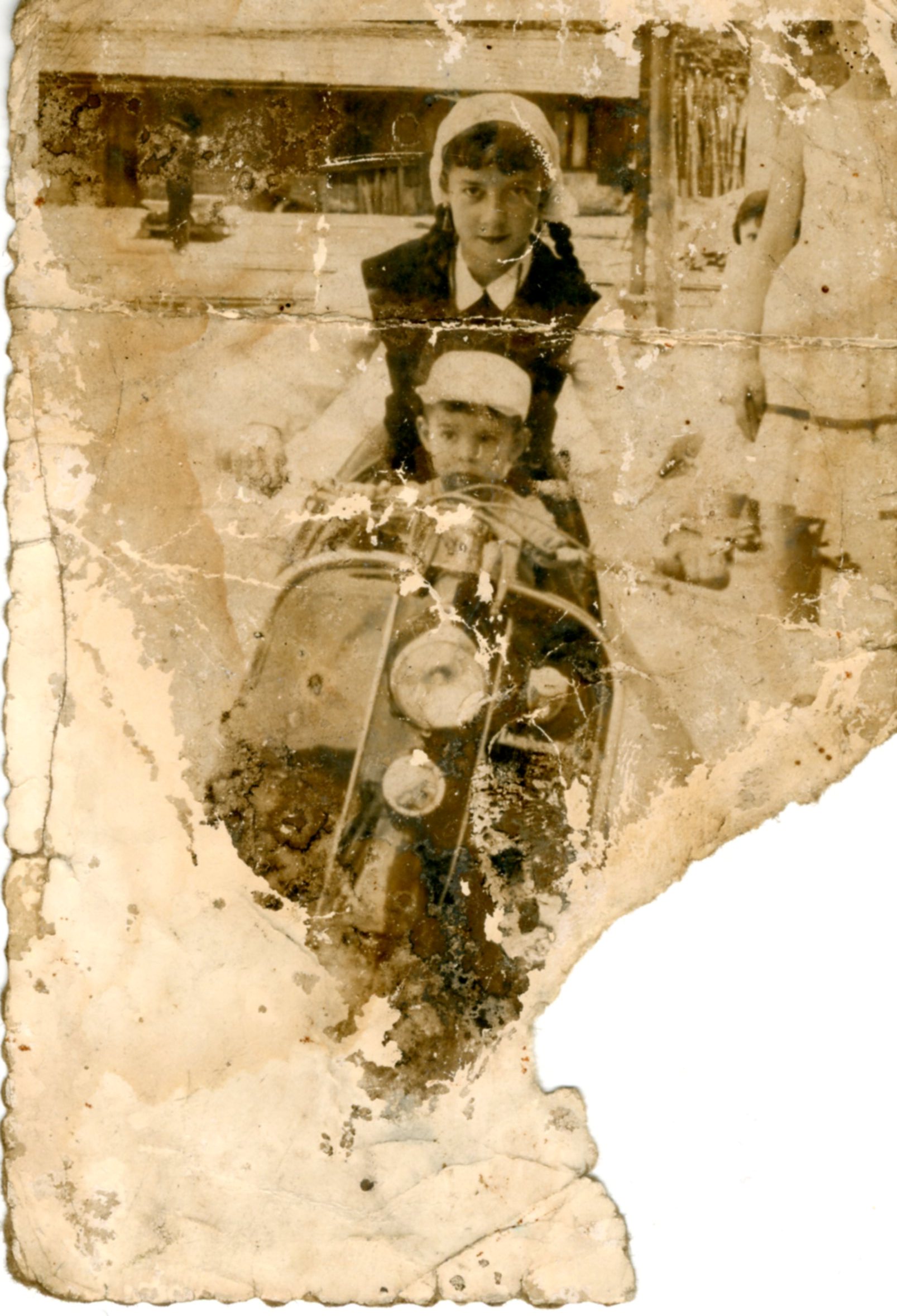 Retrato de los hermanos Fanjul-Cortina, vecinos de El Fielato, El Entrego, en el año 1958.En la fotografía aparecen subidos en su vespa, disfrutando de su tiempo de ocio.