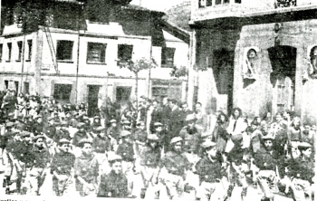 Fotografía realizada en El Entrego durante un desfile llevado a cabo en los años cuarenta.Las procesiones y desfiles fueron frecuentes durante esta década En la fotografía vemos una sección infantil de falange recordando la visita de Franco a Sama.