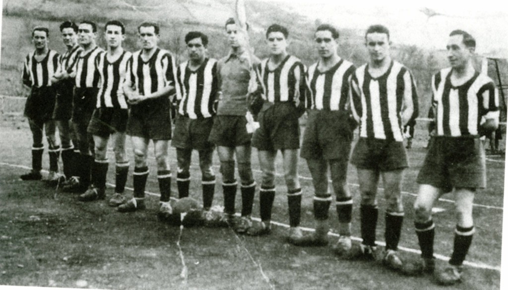 Fotografía de grupo realizada al equipo de fútbol "Unión Deportiva El Entrego" en el año 1943.Los integrantes fueron retratados en el campo Vindoria.
