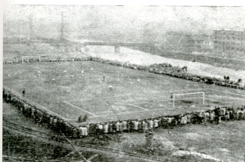 Fotografía realizada con motivo de la inauguración del campo El Nalón el 11 de julio de 1948.El citado día tuvo lugar un encuentro entre el Sporting y El Unión Deportiva El Entrego.