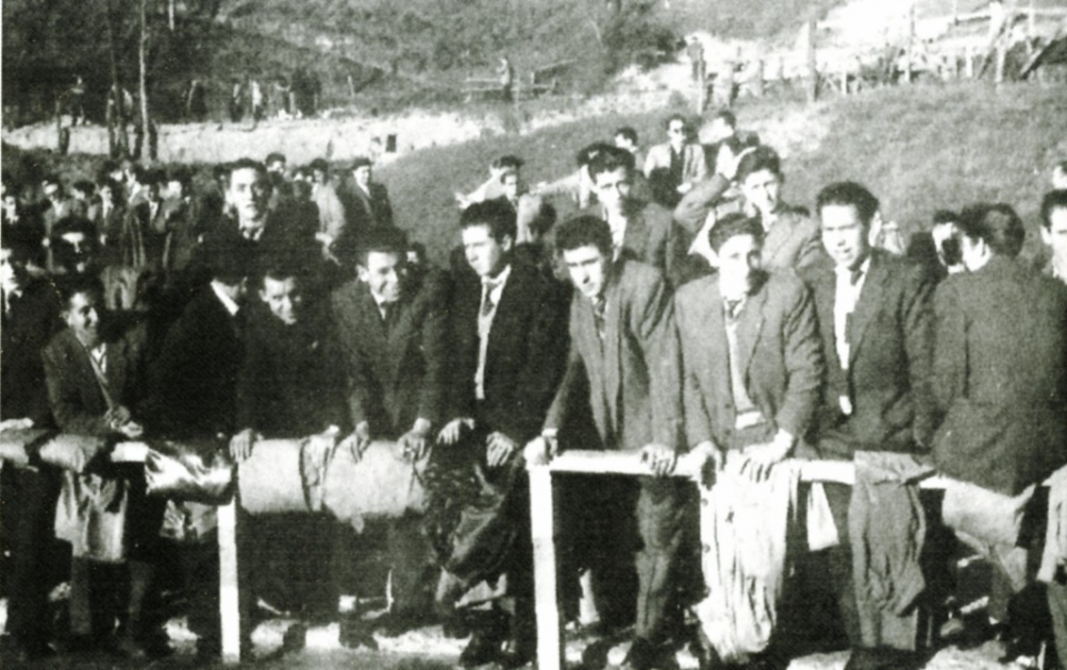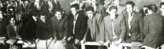 Grupo de aficionados de El Unión procedente de los barrios periféricos de Carrocera y Pumarabín.La fotografía se realizó en el campo de El Nalón con motivo de un encuentro de Primera Regional que tuvo lugar en el año 1953.