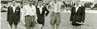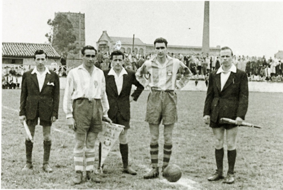 En la fotografía aparece el capitán de El Unión,Tinutu,retratado en el año 1950 junto al capitán del Cimadevilla de Gijón, figurando además el trío arbitral.