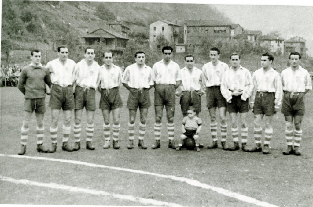 Retrato colectivo de los integrantes de El Unión Deportiva El Entrego.La fotografía se realizó en el campo de El Nalón durante la temporada 1951/52.