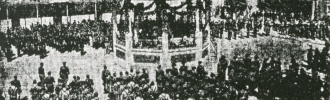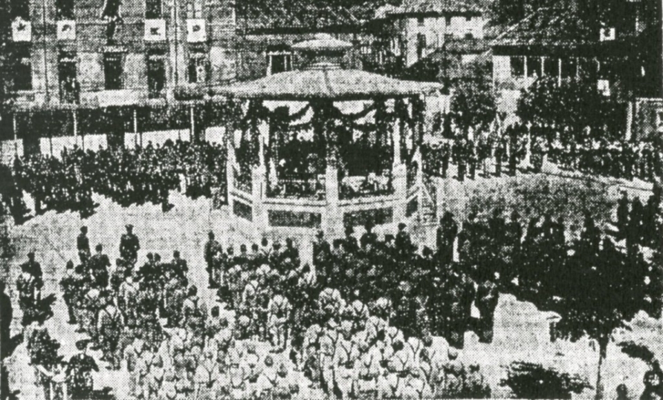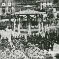 Sotrondio vivió intensas horas de fervor patriótico el domingo 6 de septiembre de 1938.En la fotografía observamos las fuerzas formadas en la plaza, tras la celebración de la Santa misa.