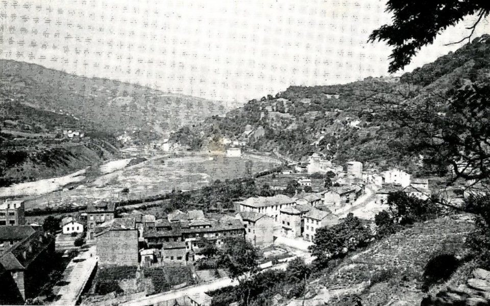 Vista parcial de Blimea en 1960.Al fondo observamos las primeras casas en La Engariella, años más tarde en esos terrenos se llevaron a cabo las siguientes edificaciones: I.E.S. de 2ª enseñanza, el nuevo campo de fútbol y el pabellón deportivo.
