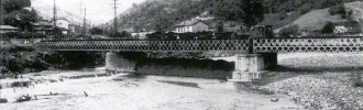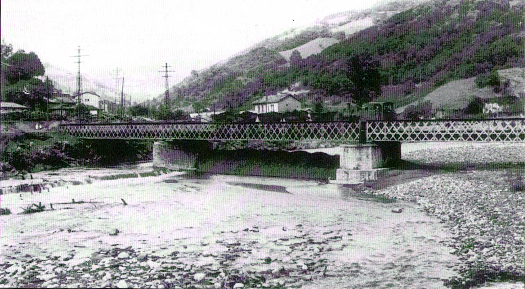 Panorámica del Puente de Carrocera salvando el río Nalón a su paso por L'Entregu/El Entrego. Fotografía realizada en el primer tercio del siglo XX.